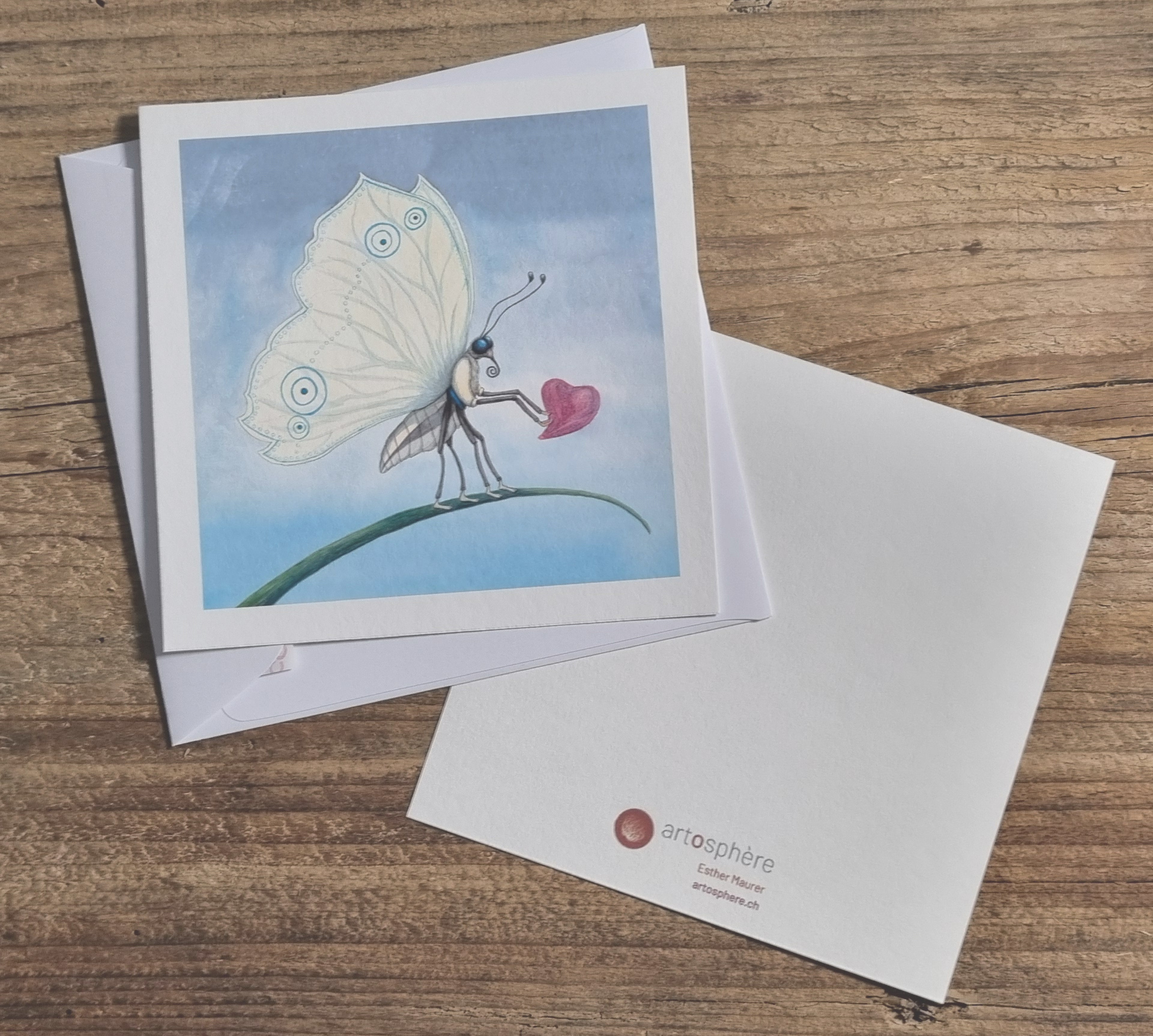 Carte au format 15x15 cm (un seul côté, non pliée), imprimée sur papier bambou haute qualité 290 g/m2, avec enveloppe blanche.