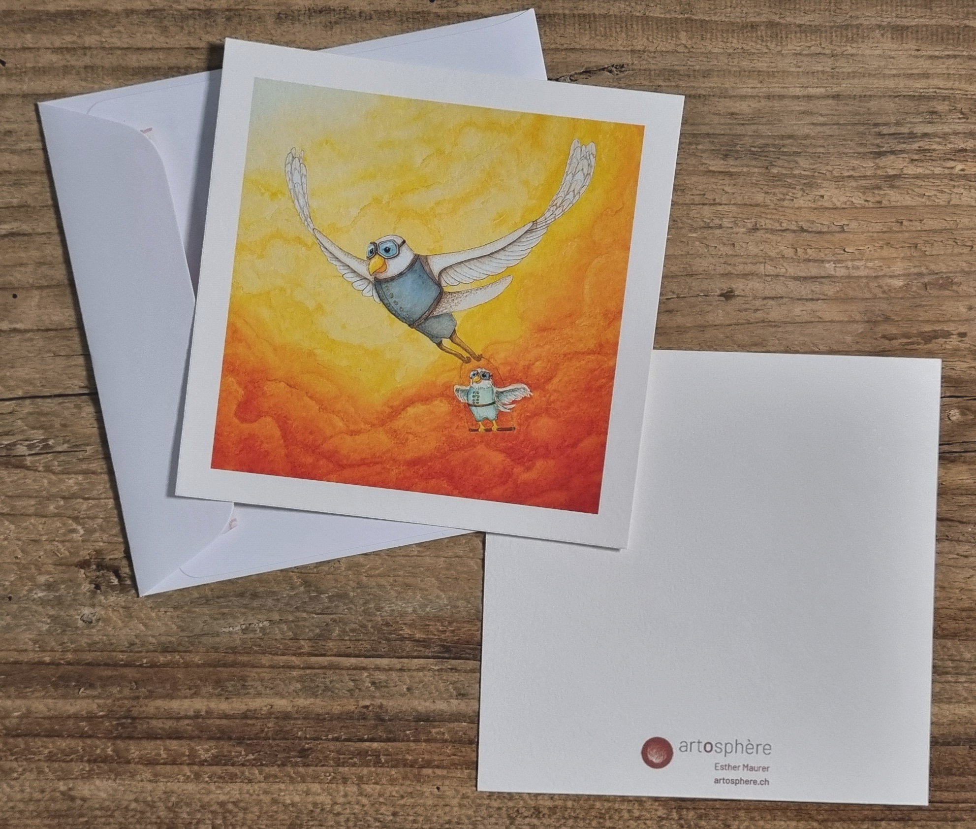 Carte au format 15x15 cm (un seul côté, non pliée), imprimée sur papier bambou haute qualité 290 g/m2, avec enveloppe blanche.