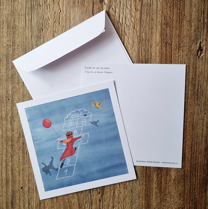 Carte imprimée en Suisse, sur papier blanc 300 g/m2, format 15x15 cm (un seul côté, non pliée), avec enveloppe blanche.