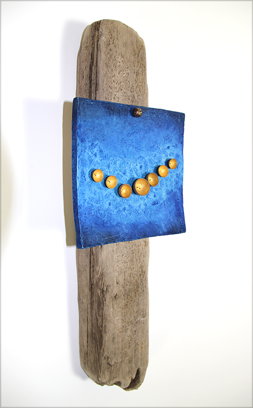 Sculpture murale en carton-terre (carton mâché, argile et poudre de craie), peinte à l'huile et pigments, avec cupules de glands dorés,